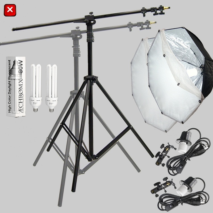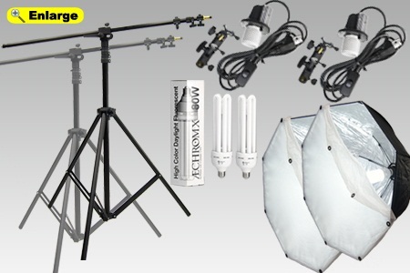 This double Aebrellabox kit and boom stand – our most popular kit – excellent team for portraits and especially, product shots. Use above and behind the subject to reveal shape and texture; the second left or right of camera for highlight and shadow across the front of the subject. |