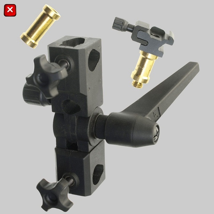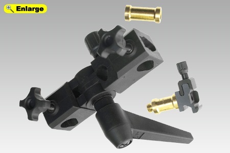 One of the most clever and useful adapter to articulate light sources atop a light stand or other fastener. Features a speedlight adapter (AE44HS03) and many other lamp holders (5/8" standard). Also provides an umbrella placement. |